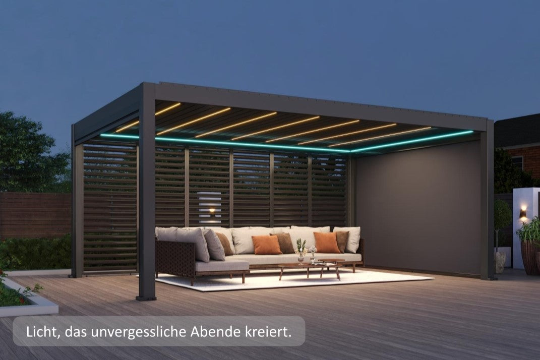 Im Rahmen der Pergola sind wetterfeste RGB-LED-Streifen integriert, die in sämtlichen Farben leuchten und individuell steuerbar sind. In den Lamellen selbst befindet sich eine warmweisse LED-Beleuchtung, die für ein angenehmes, stimmungsvolles Licht sorgt. Sowohl die RGB-Beleuchtung im Rahmen als auch das warmweisse Licht in den Lamellen sind vollständig dimmbar – steuerbar per App, Sprachbefehl oder Fernbedienung.